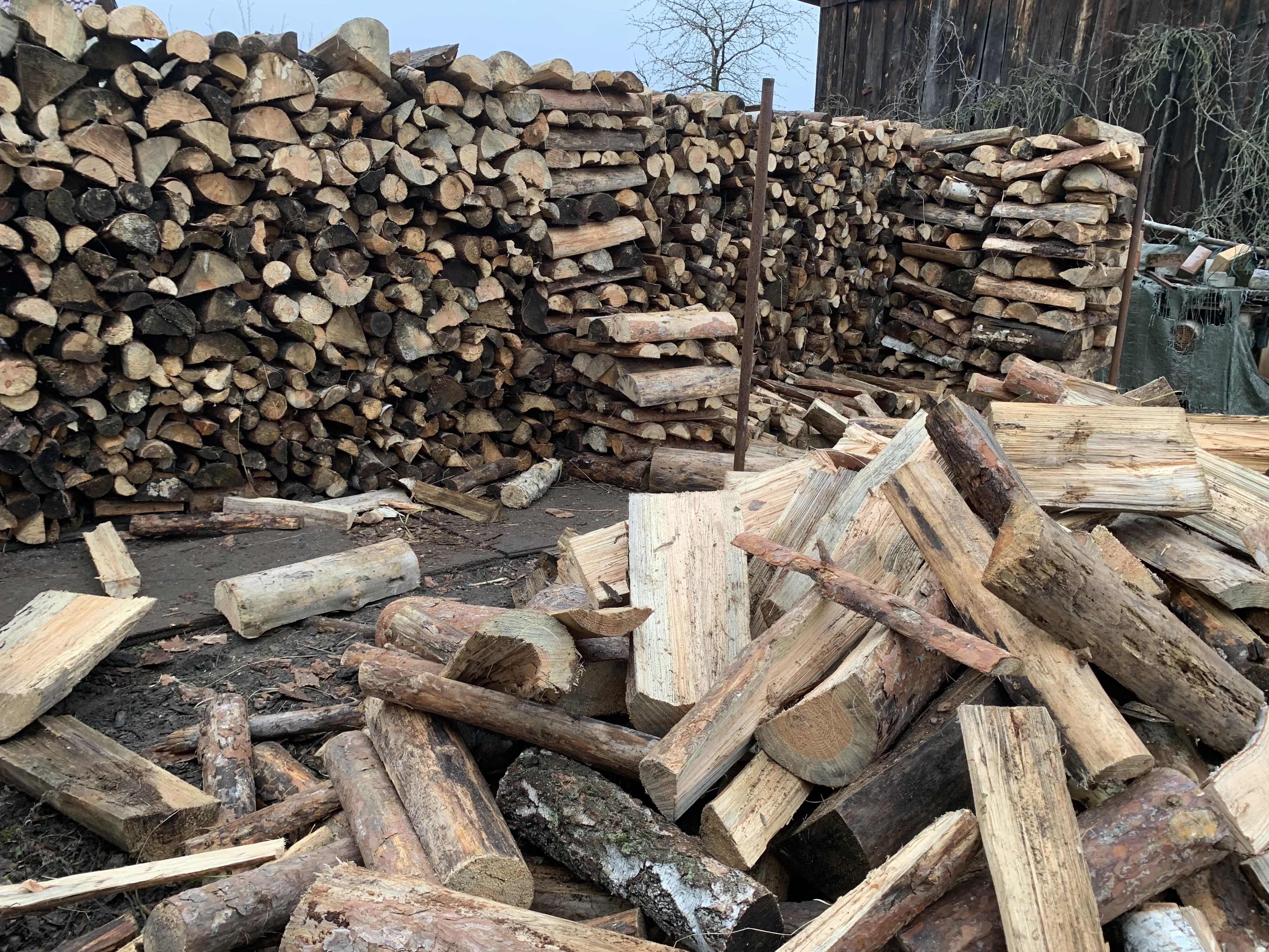 Holz im mehreren Reihen geklaftert und ein großer Haufen Kaminholz wartet noch darauf gestapelt zu werden. Damit das gestapelte Holz stabil steht sollte man am Anfang und am Ende sowie in regelmäßigen Abständen in der Mitte kreuzweise stapeln.