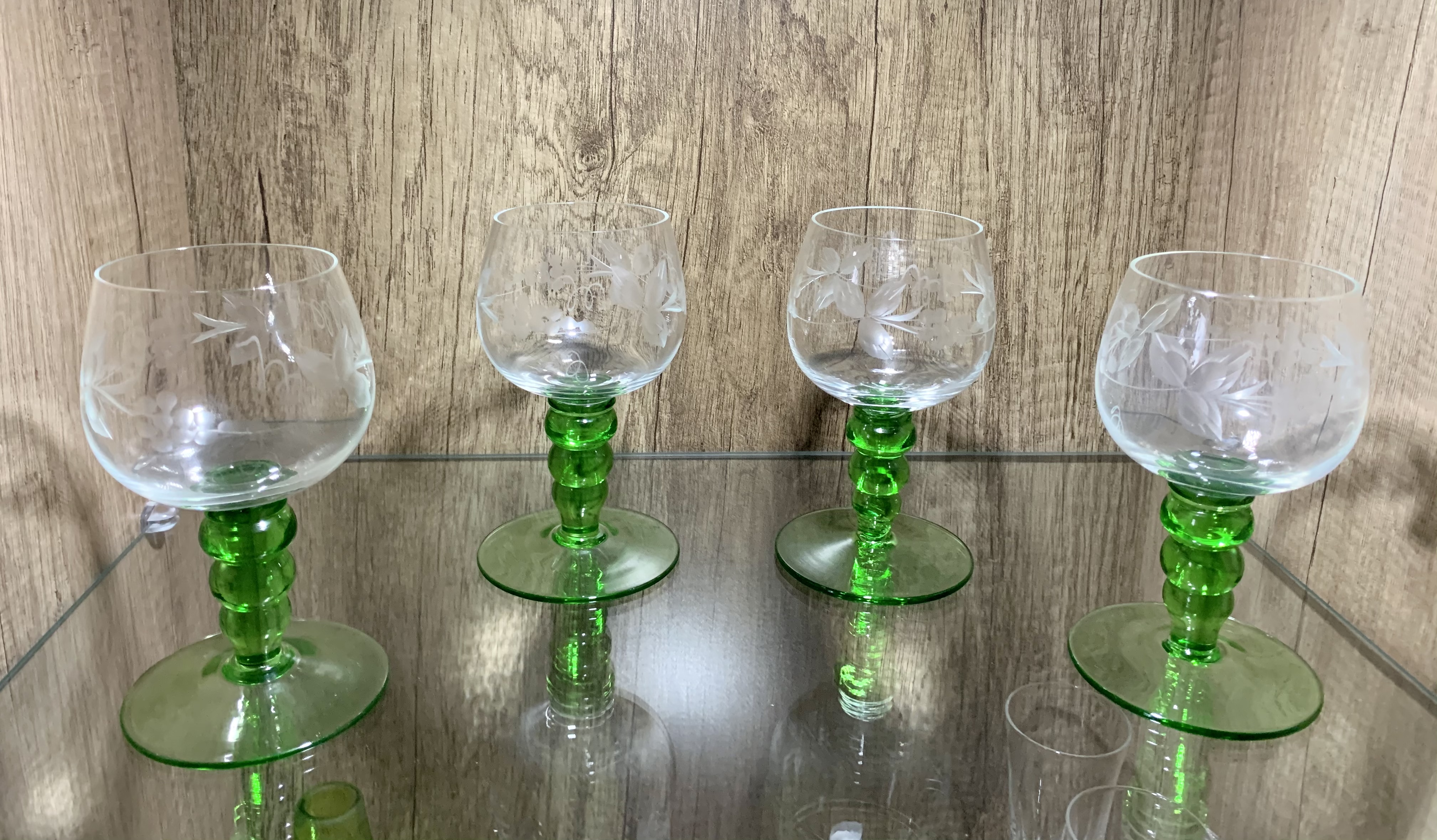 stilvolle Weingläser mit eleganter Gravur als Ensemble positioniert in einer Vitrine. Der grüne geriffelt Stiel der Weingläser verleiht dem Weingenuss eine besondere Note.