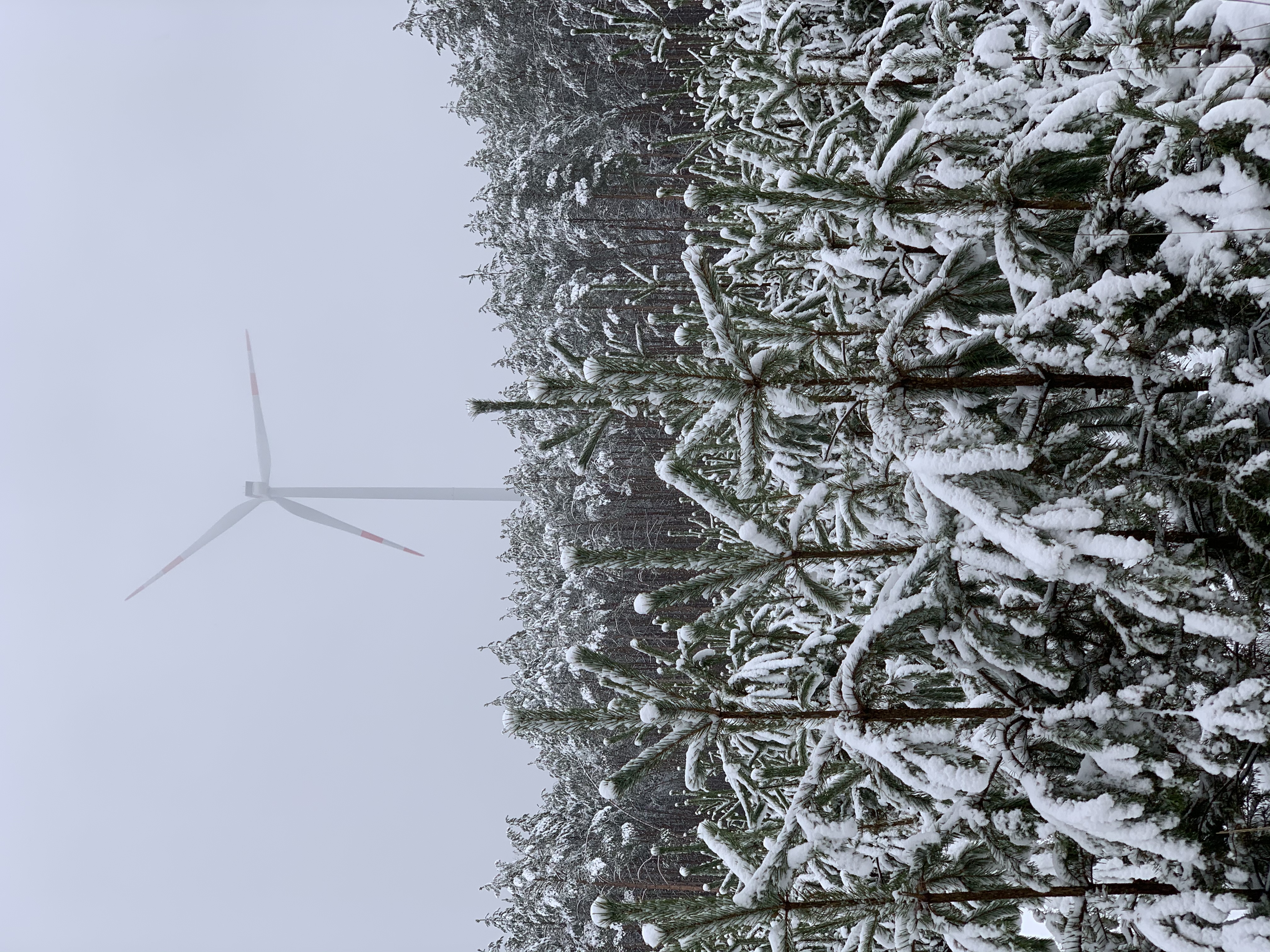 ein Windrad verrichtet seine Arbeit im Winterwald