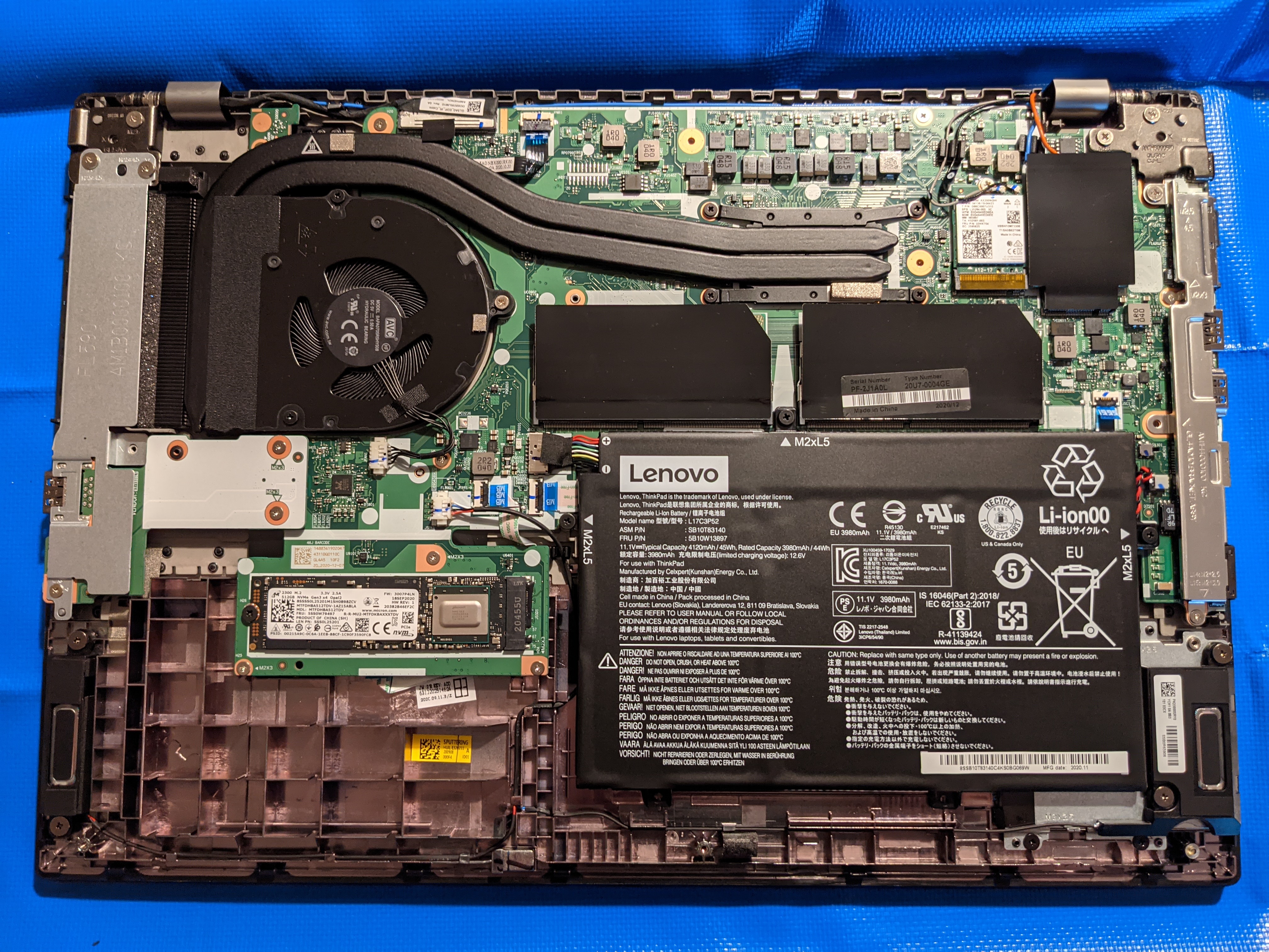 Ein geöffneter Laptop mit sichtbarer Hauptplatine, Akku, SSD, RAM, CPU und Kühlung.