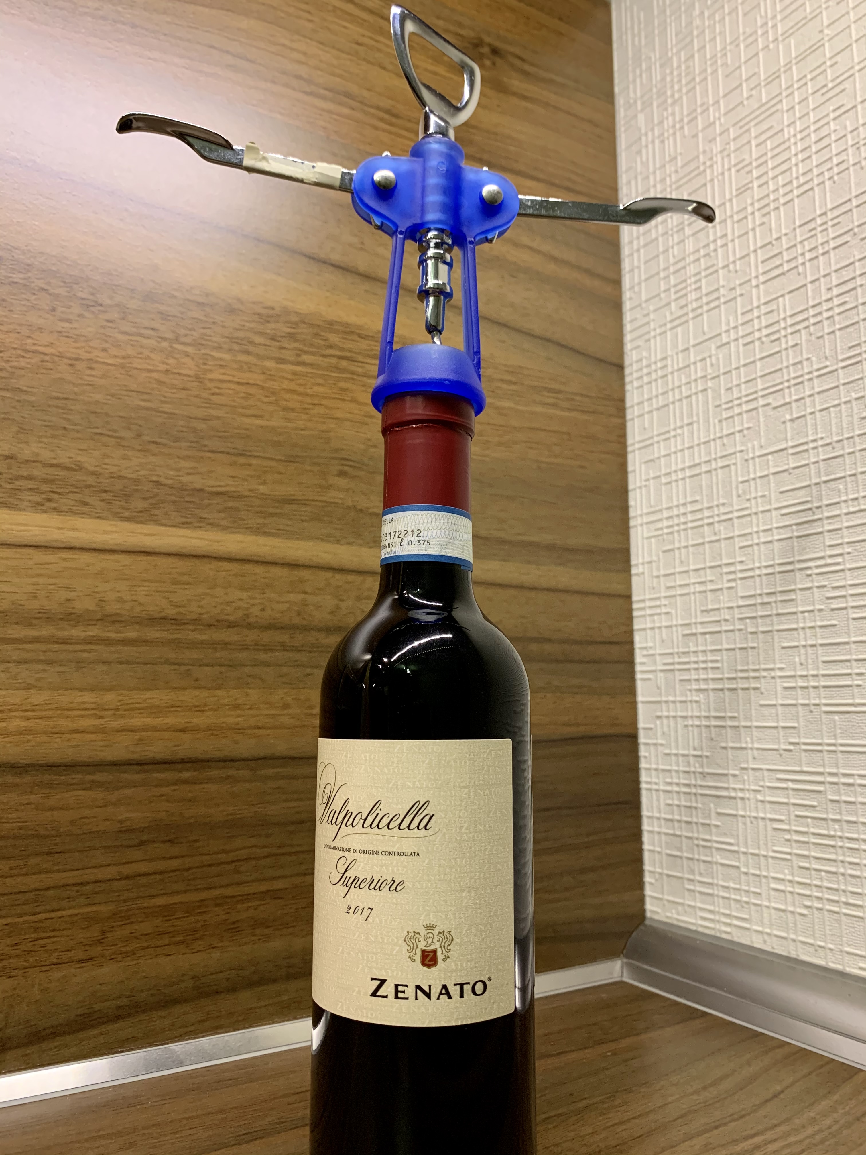 Der Korkenzieher auf der Weinflasche führt eine kleine Turnübnung vor, kurz vor der Entkorkung des Rotweins.