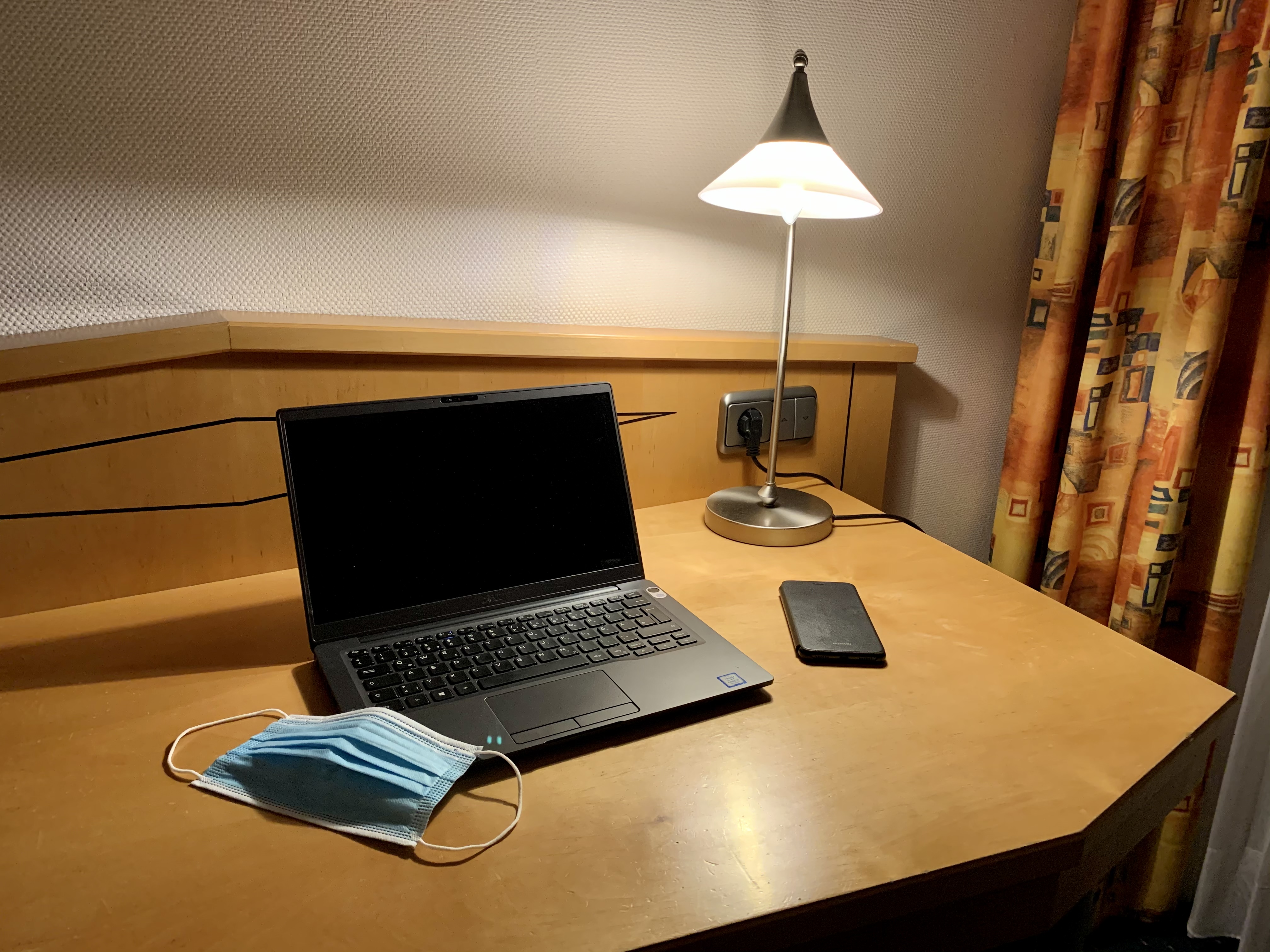 - abgedunkelt, AHA, Alltagsmaske, Arbeit, Arbeitsplatz, Computer, Corona, Desk, Handy, Hotel, Lampe, Laptop, Maske, Mund-Nase-Schutz, Notebook, PC, Schreibtisch, Schreibtischlampe