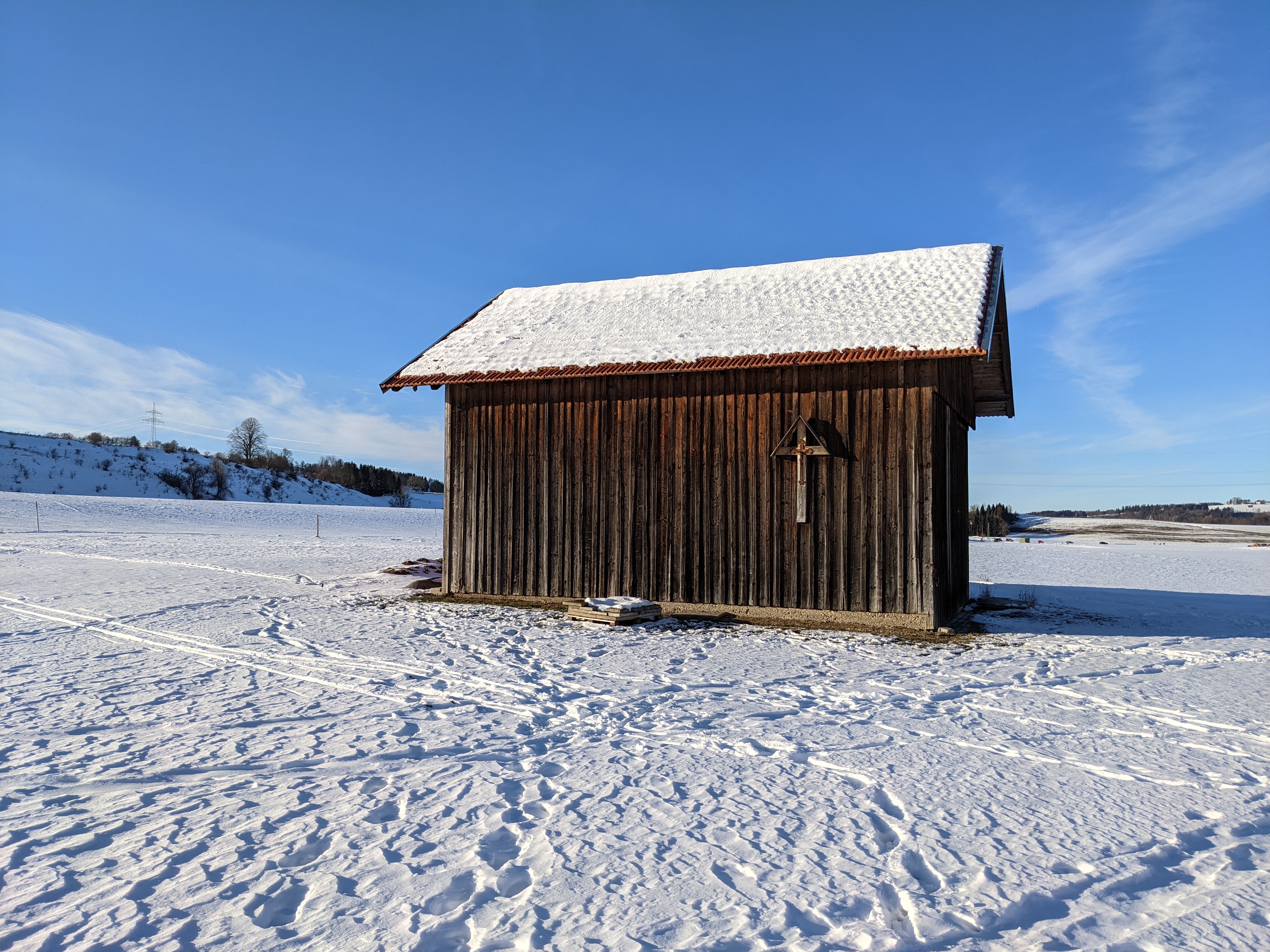- Blau, Himmel, Holz vor der Hütte, Holzhütte, Hütte, Kreuz, Religion, Schnee, Stadl, Winter, winterlich
