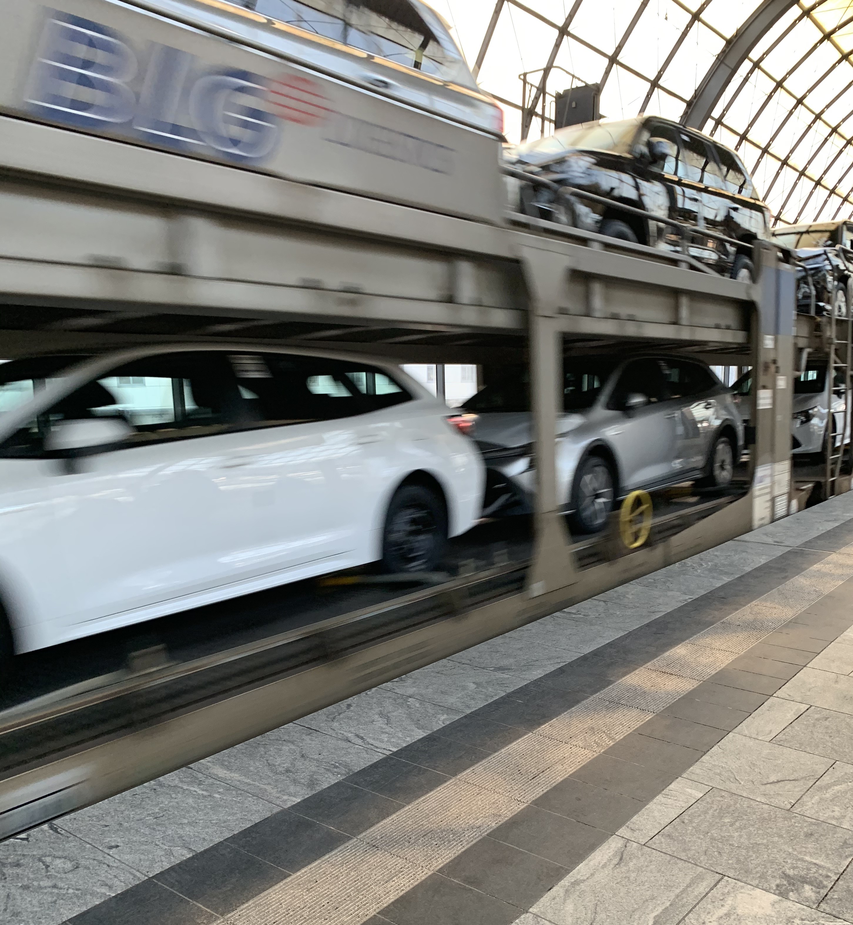 ein durch den Bahnhof rasender Zug, welcher viele Autos/PKWs transportiert.