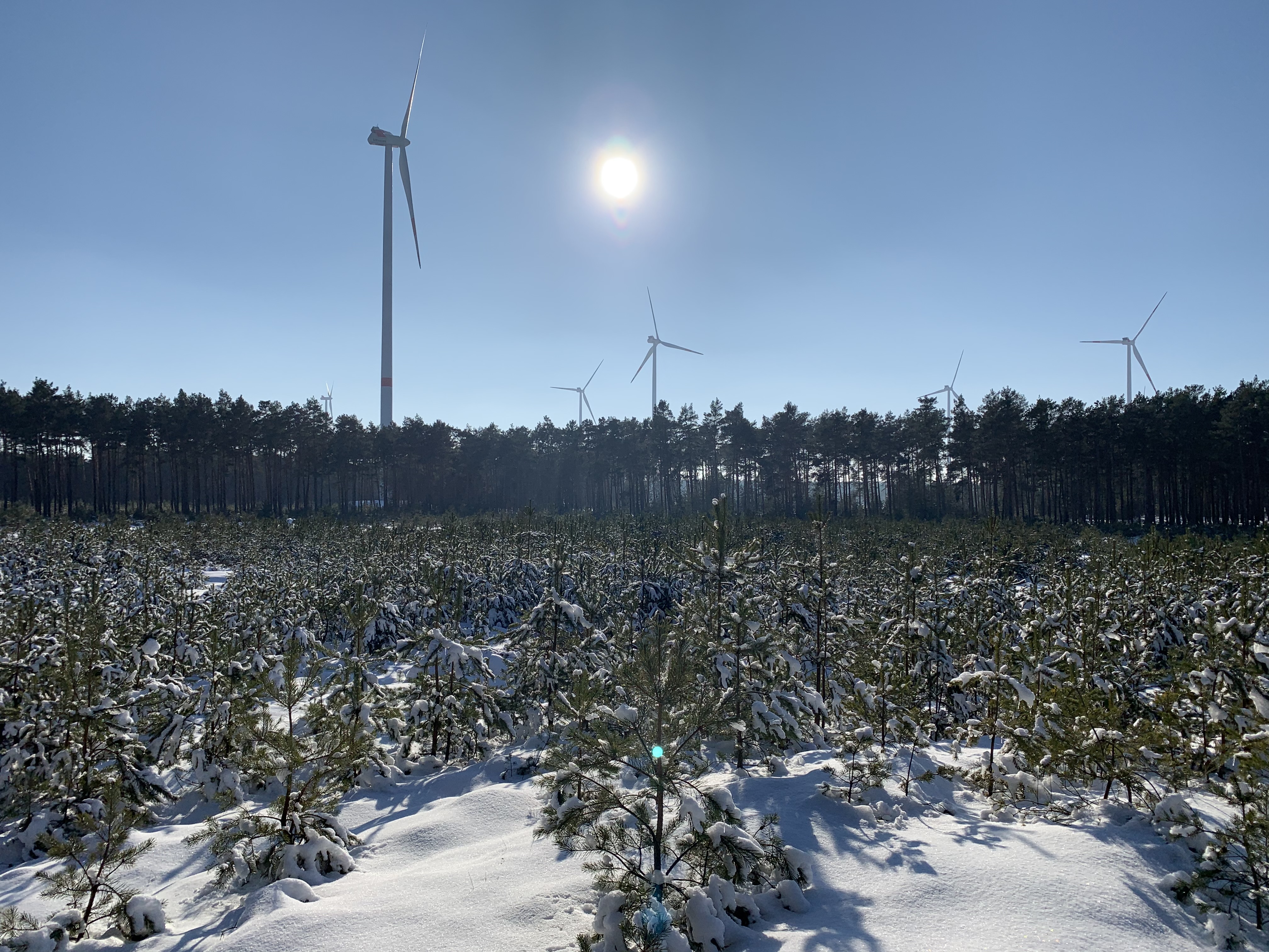 Sonniger Winterwald zeigt junge Kiefern im Schnee. Im Hintergrund verrichten die Windräder keine Arbeit in dieser windstillen, sonnigen Winterlandschaft.