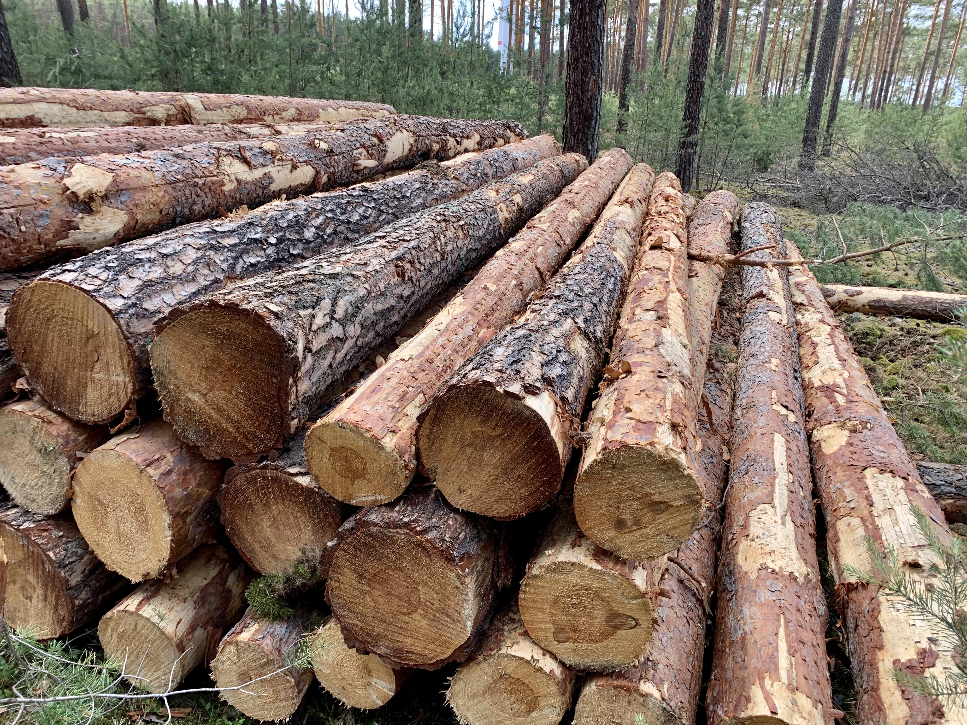Geklaffterte Baumstämme nachdem ein Harvester den Wald gerodet hat. Es richt nach frisch eingeschlagenem Holz im Wald
