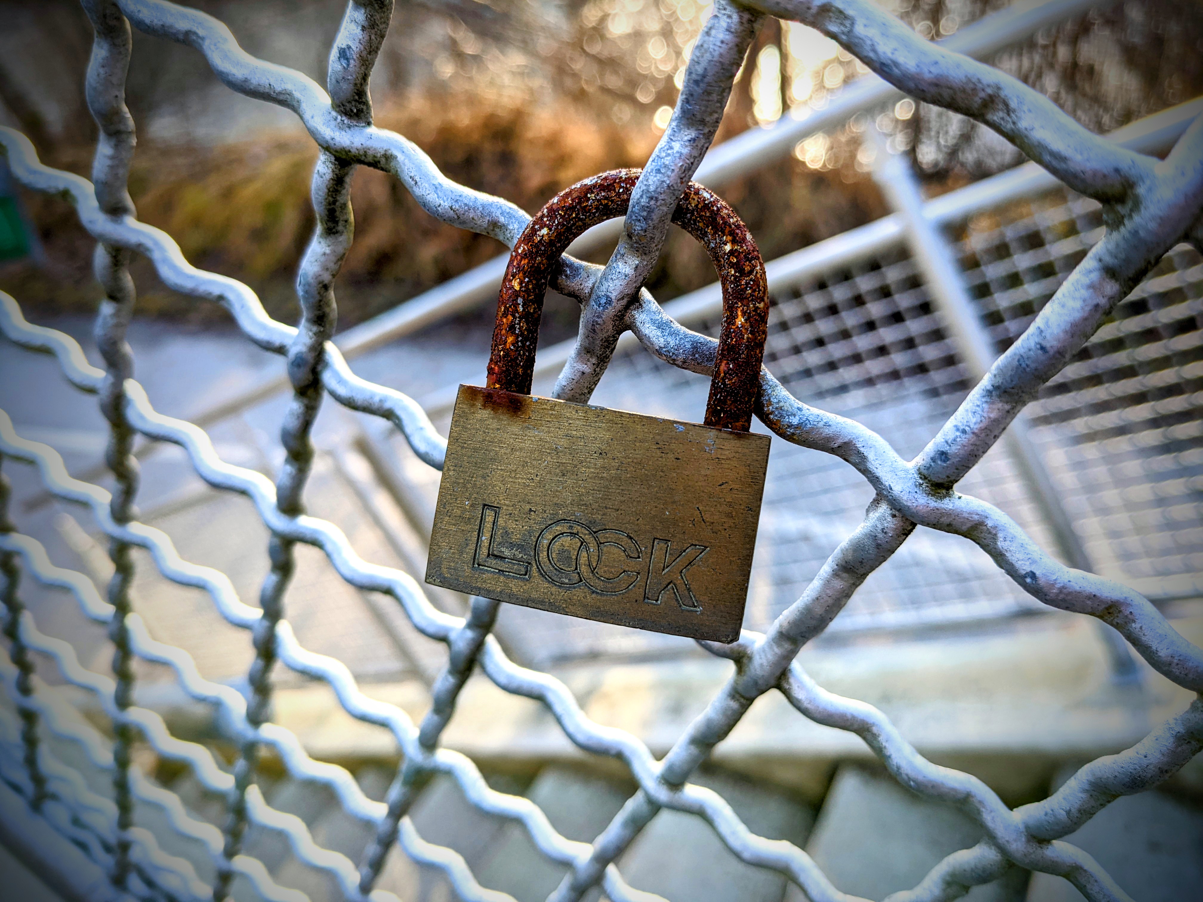 Ein Vorhängeschloss an einem Zaun.