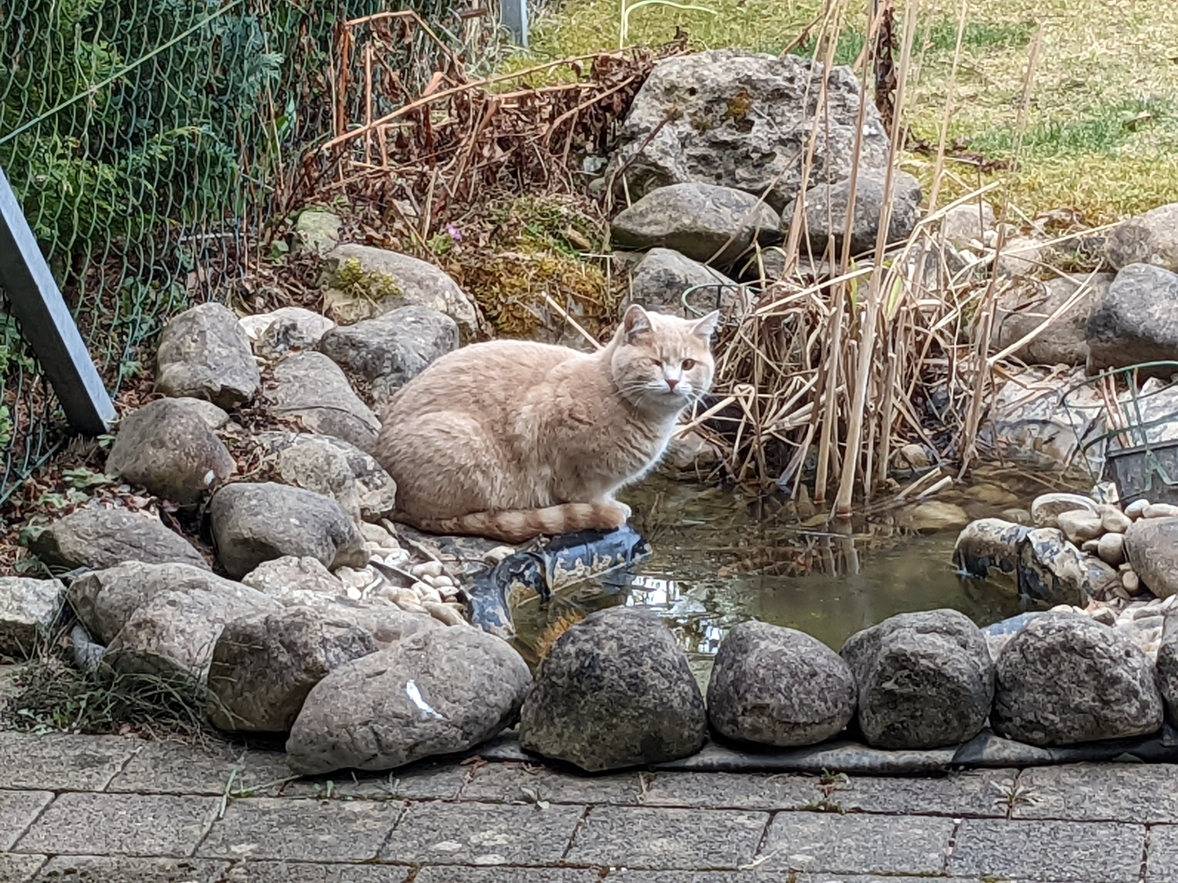 Eine einäugige Katze lauert am Gartenteich in der Hoffnung die Fische zu fangen.