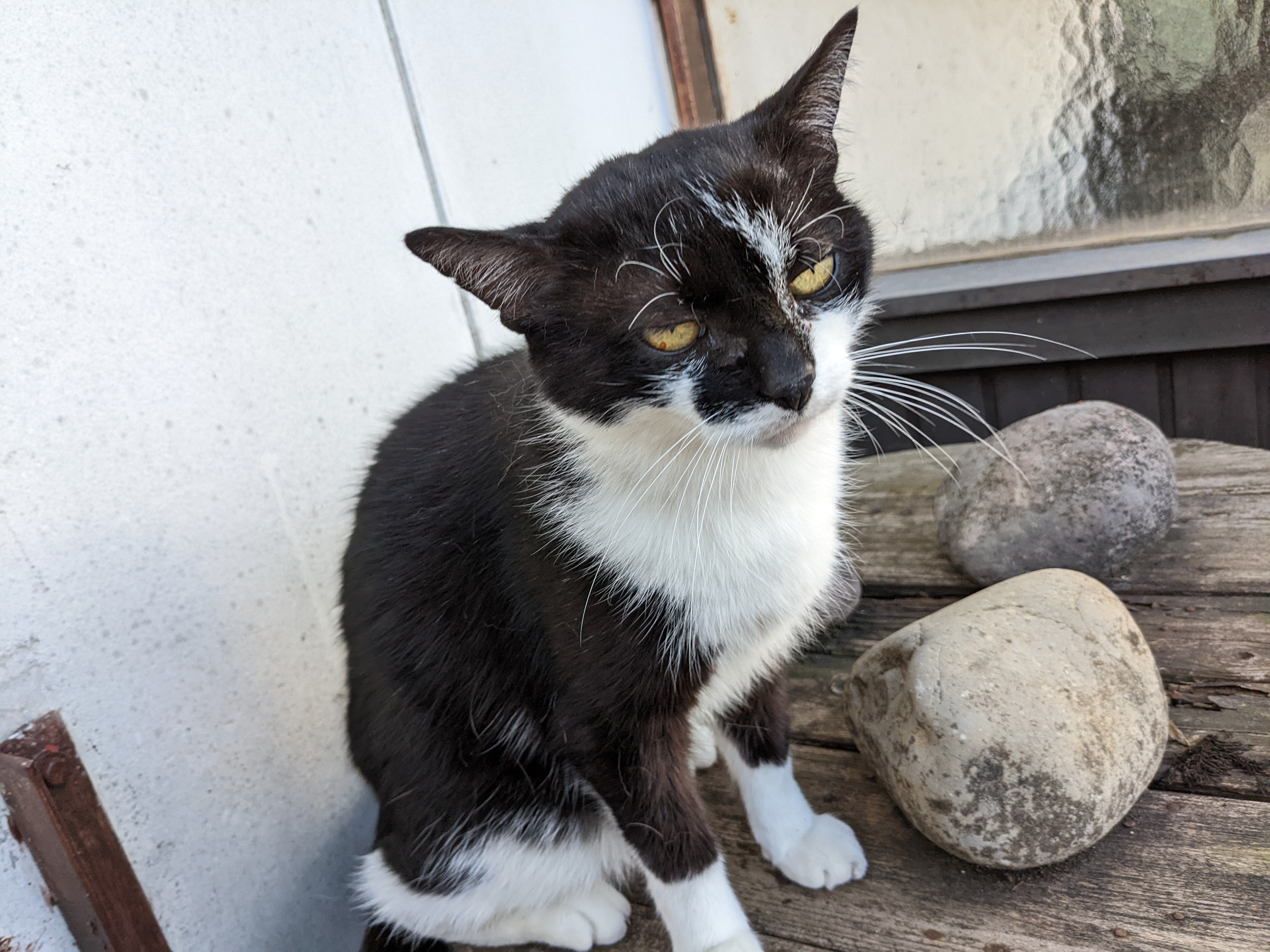 Eine leicht gelangweilte, genervte Katze, sitzend auf einem Holzfass mit Steinen