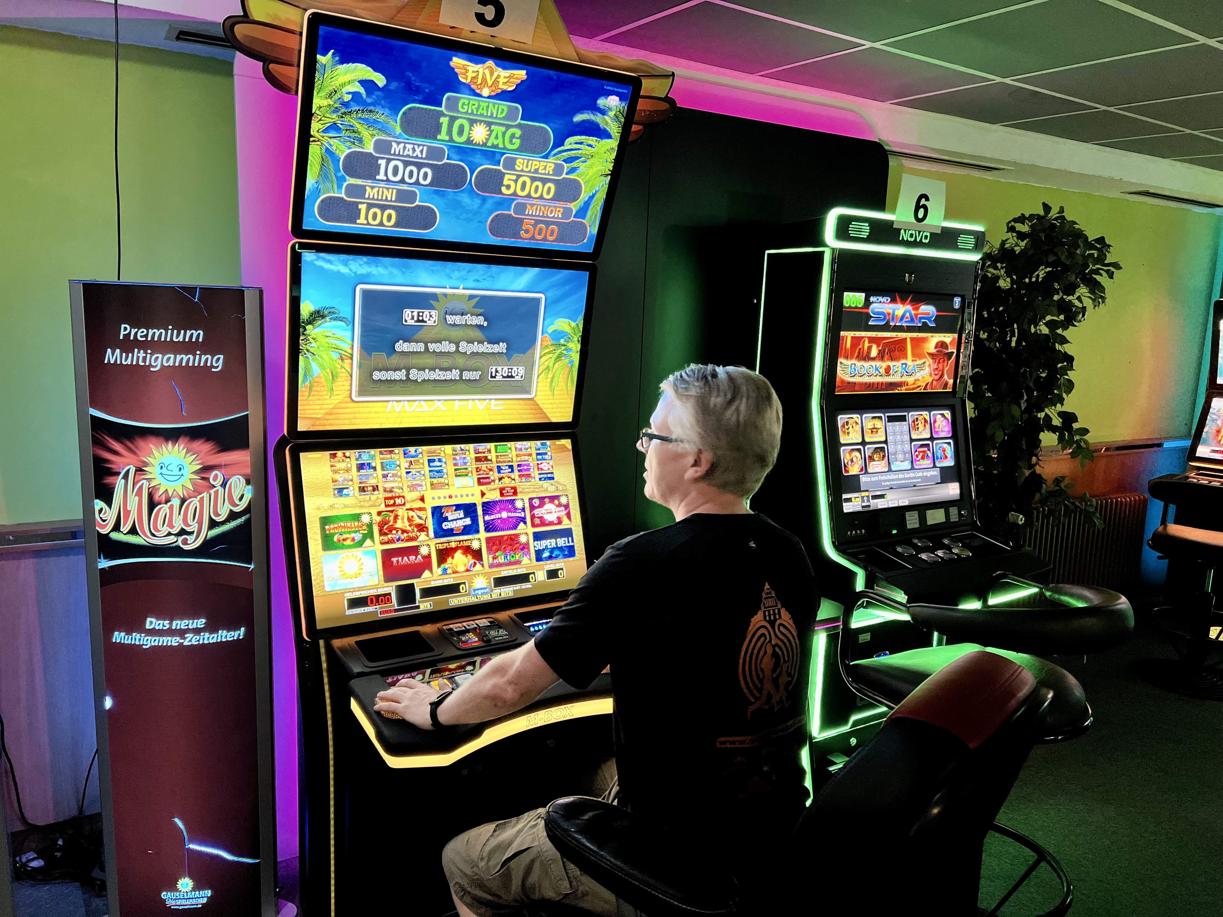 Mann verspielt sein letztes Hemd in einem Casino am Spielautomaten.