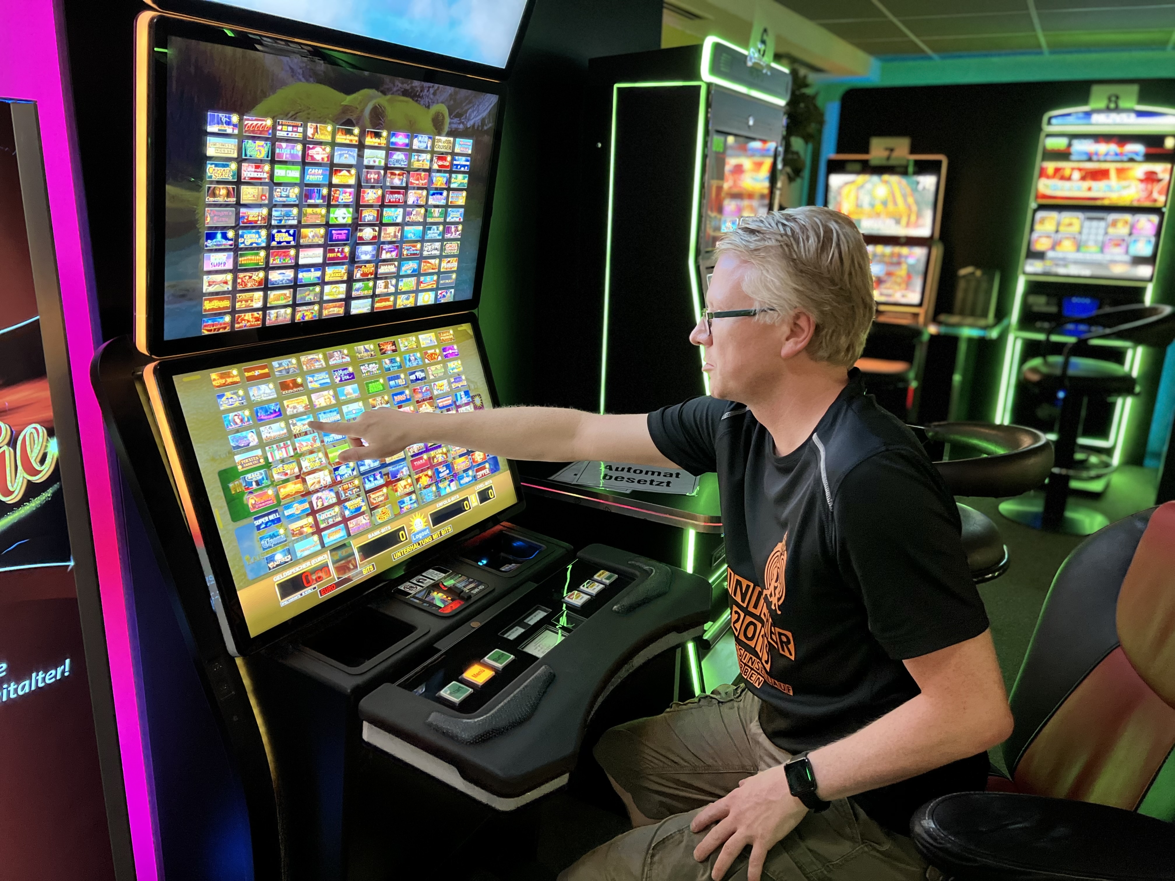 Junger Mann versucht sein bescheidenes Glück an einem Spielautomat.